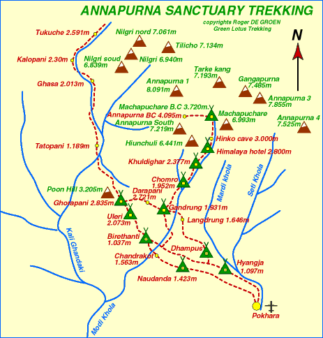 Annapurna Base Camp Trek Map. It literally brings you face to face with an eight-thousander - for a moderate-difficult trek, this is incredible! This is an online Annapurna base camp trek map kindly provided to us by Himalayan Map House.